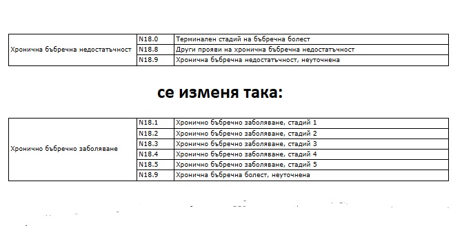 Въвеждат се нови МКБ кодове, които определят проследяването на хронично бъбречно заболяване (ХБЗ) и неустановена бъбречна болест, на база клинични изследвания. Пациентите ще бъдат проследявани при личните лекари. С измененията в Наредба № 9 се регламентират и показателите за различните стадии на ХБЗ – виж таблиците: